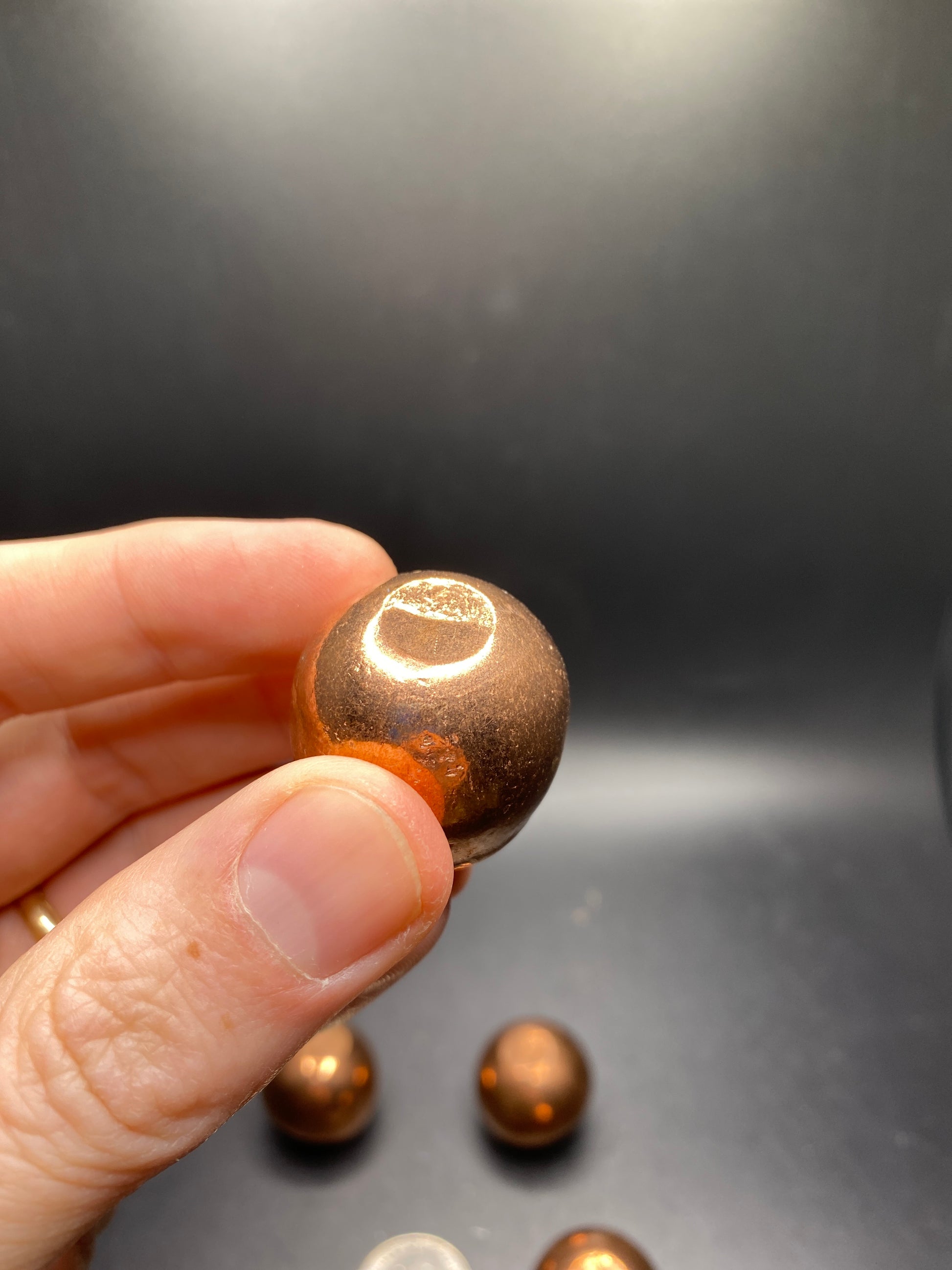 Hand-crafted from pure Michigan copper, our Copper Spheres are an elegant addition to any home. The flat ends on two sides give them a unique look from the moulding process, while their weight - at around 100g - make them both sturdy and visually balanced. Perfect for adding a touch of luxury to any space.