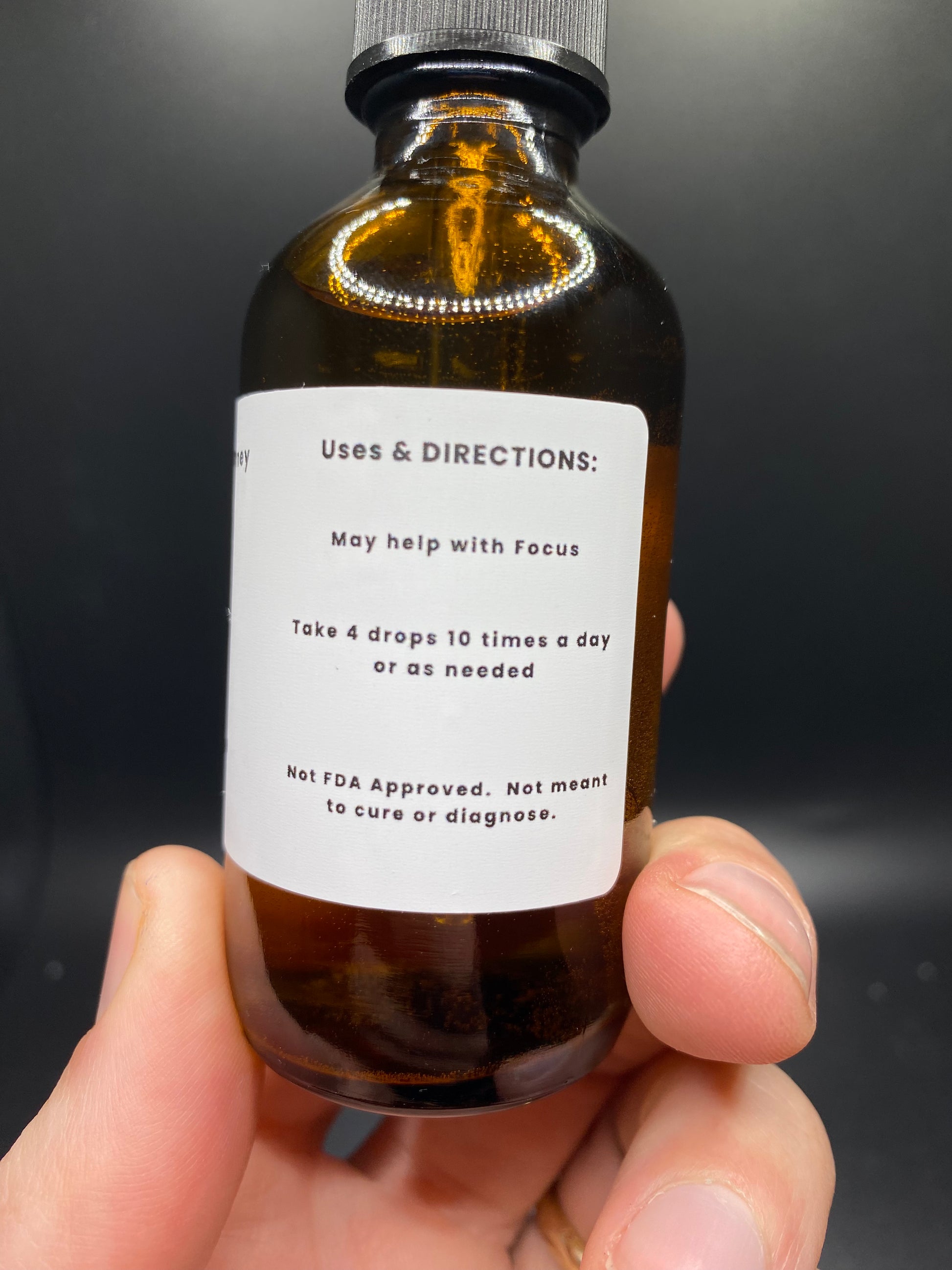 Directions: Take 4 drops by mouth 10 times a day or when needed. Keep by your computer if you have a big project you are working on. Or take before doing a chore that you've been putting off and see how much you get done. When trying out our Elixir for the first time Matt cleaned the garage, basement, and laundry room. It was like he was on a ton of caffeine but without the crash! No interruption of sleep either.