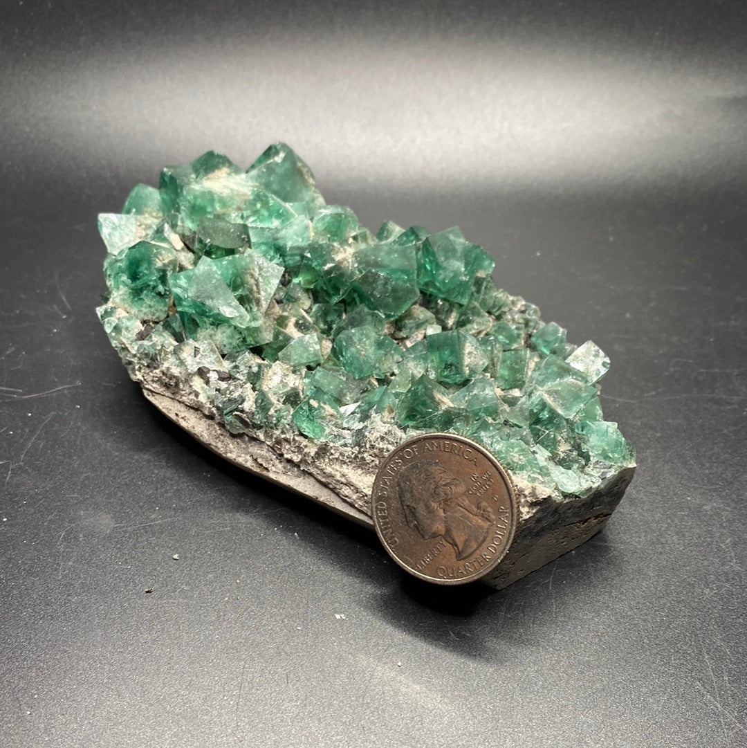 This is a one of one Fluorite specimen from the Hidden Forest Pocket in the UK. This Fluorite will show hints of blue when exposed to sunlight. Weight is 332g.