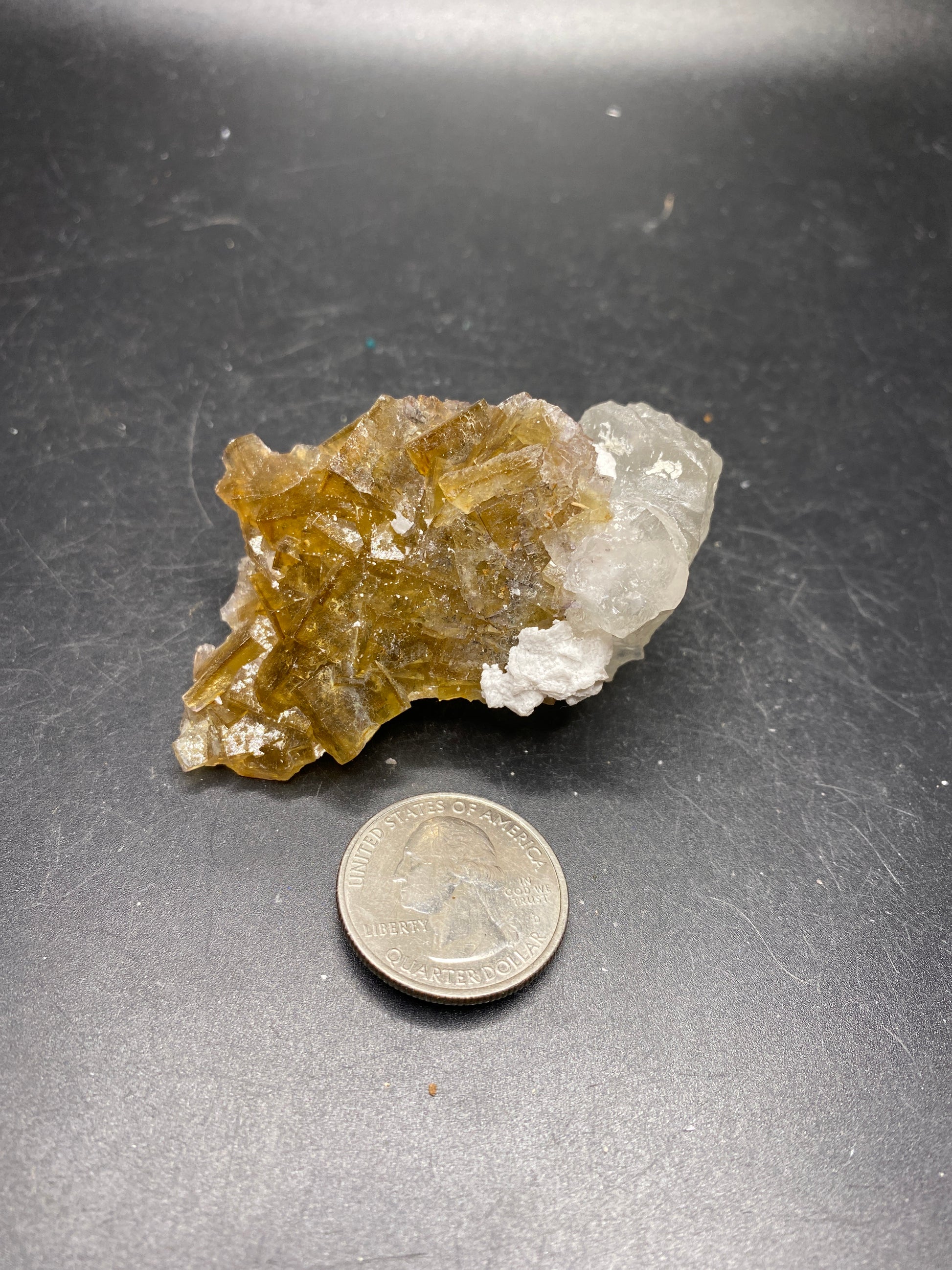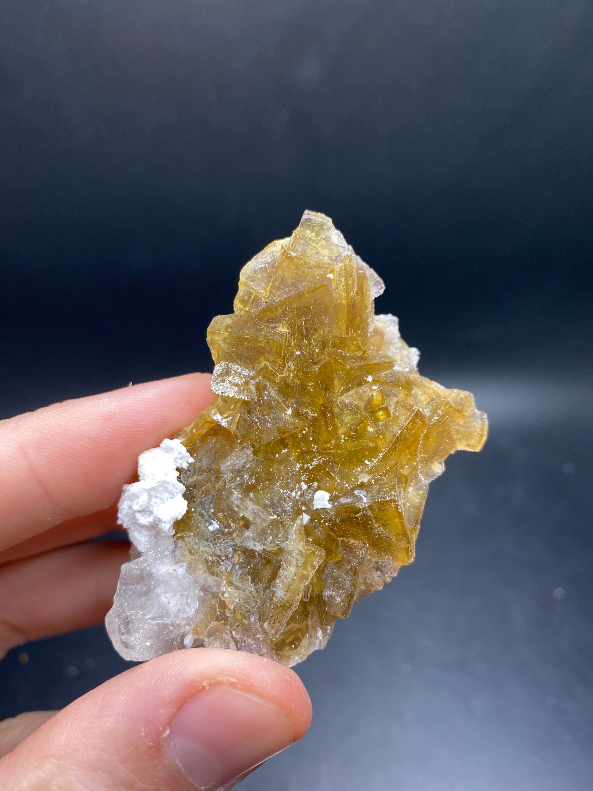 This is a one of one Fluorite Specimen from the Moscana mine in Spain. Fluorite from this location has great yellow color and also often includes Barite, Dolomite, Dogtooth Calcite, and Chalcopyrite.