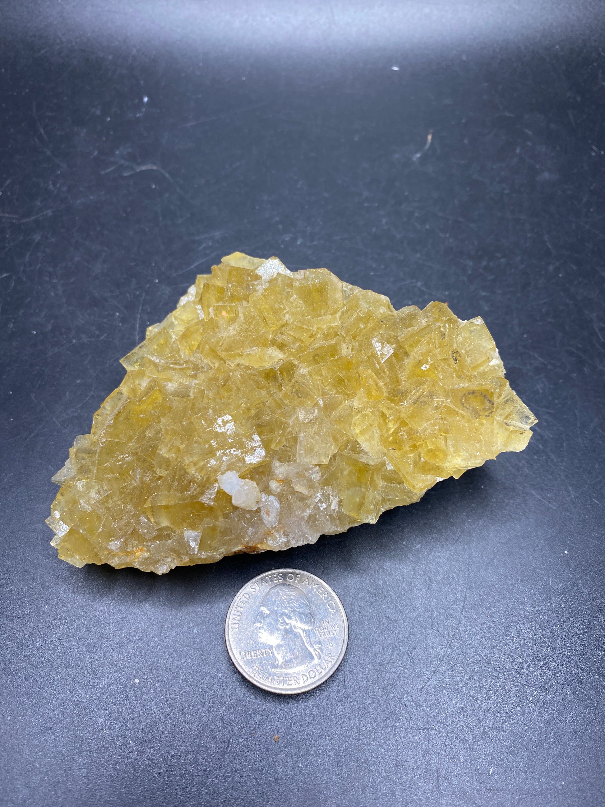 This is a one of one Fluorite Specimen from the Moscana mine in Spain. Fluorite from this location has great yellow color and also often includes Barite, Dolomite, Dogtooth Calcite, and Chalcopyrite.