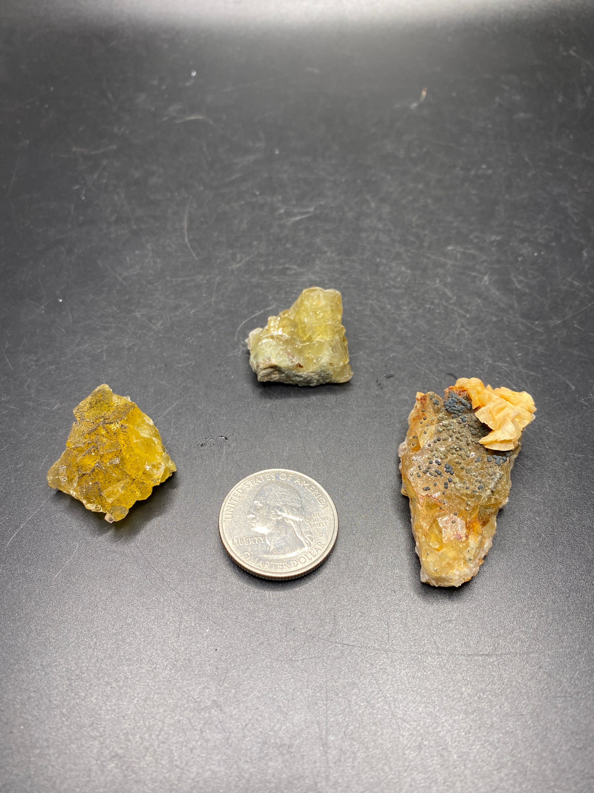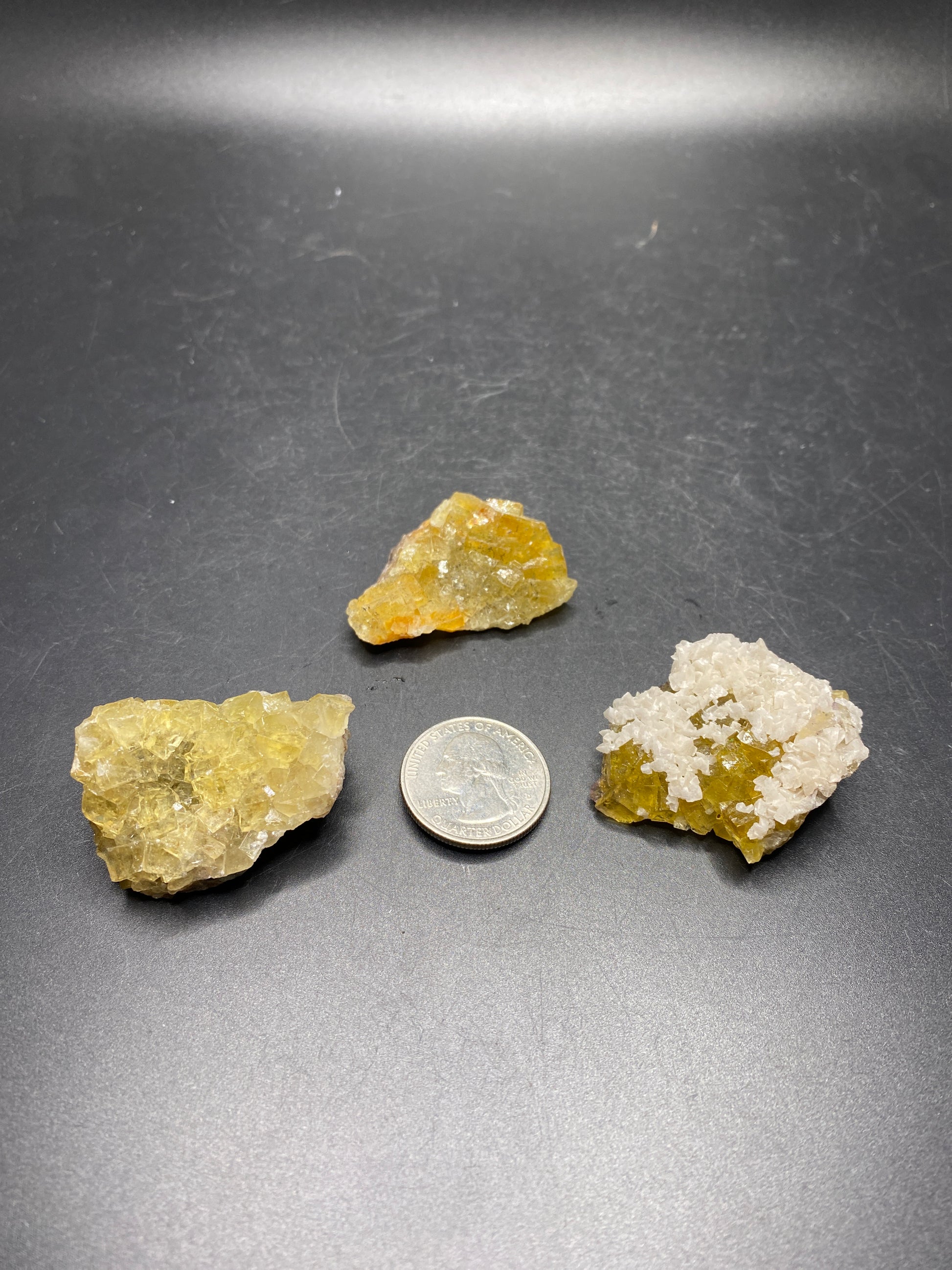 Fluorite Specimens from the Moscana mine in Spain. Fluorite from this location has great yellow color and also often includes Barite, Dolomite, Dogtooth Calcite, and Chalcopyrite.