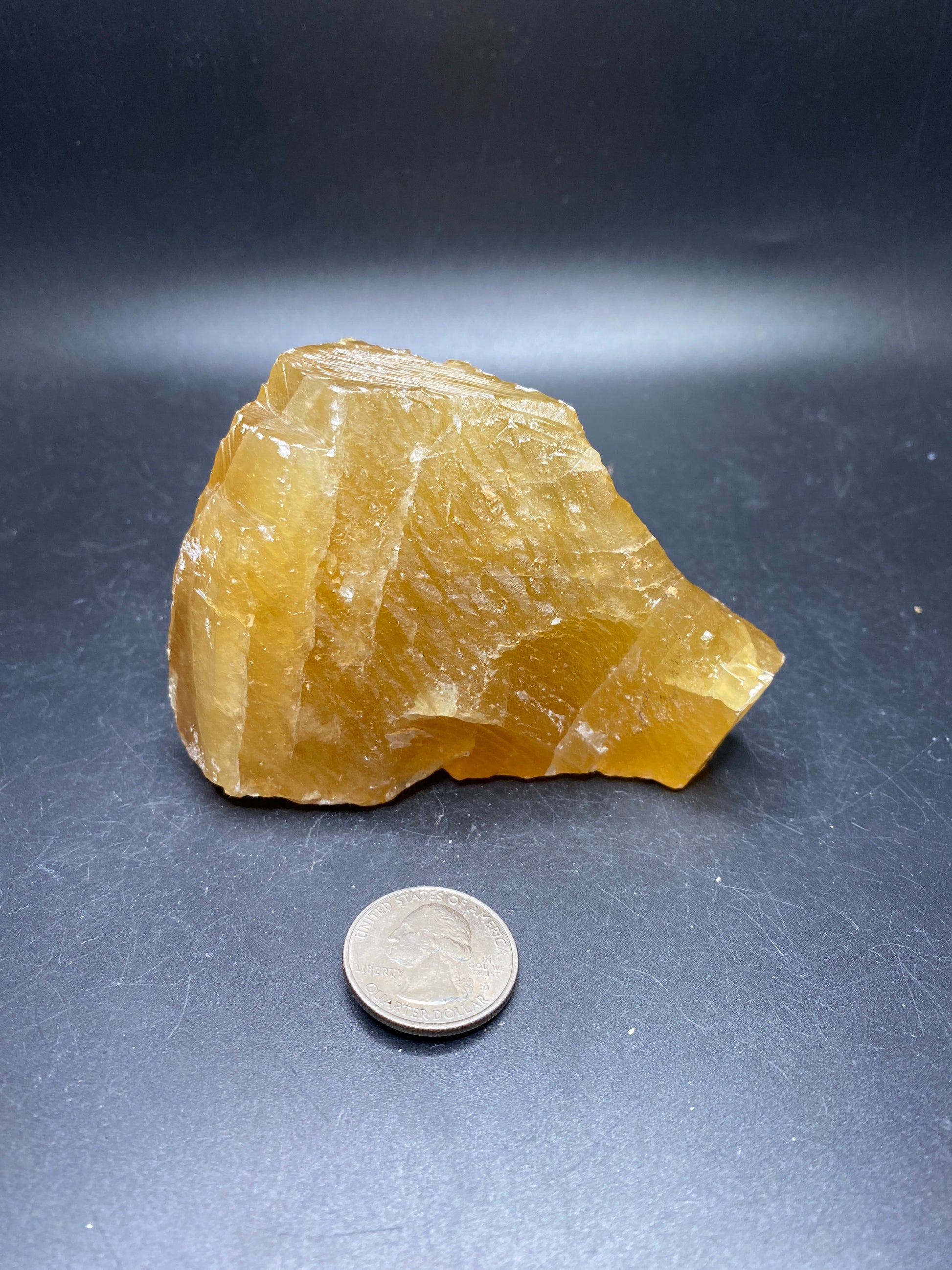 This large raw honey calcite is from Mexico. It weighs 383 grams and is roughly 4 inches long.
