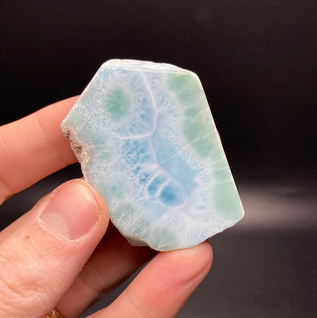 This is a high grade polished slab of Larimar from the Dominican Republic. Weighs 46.8g.