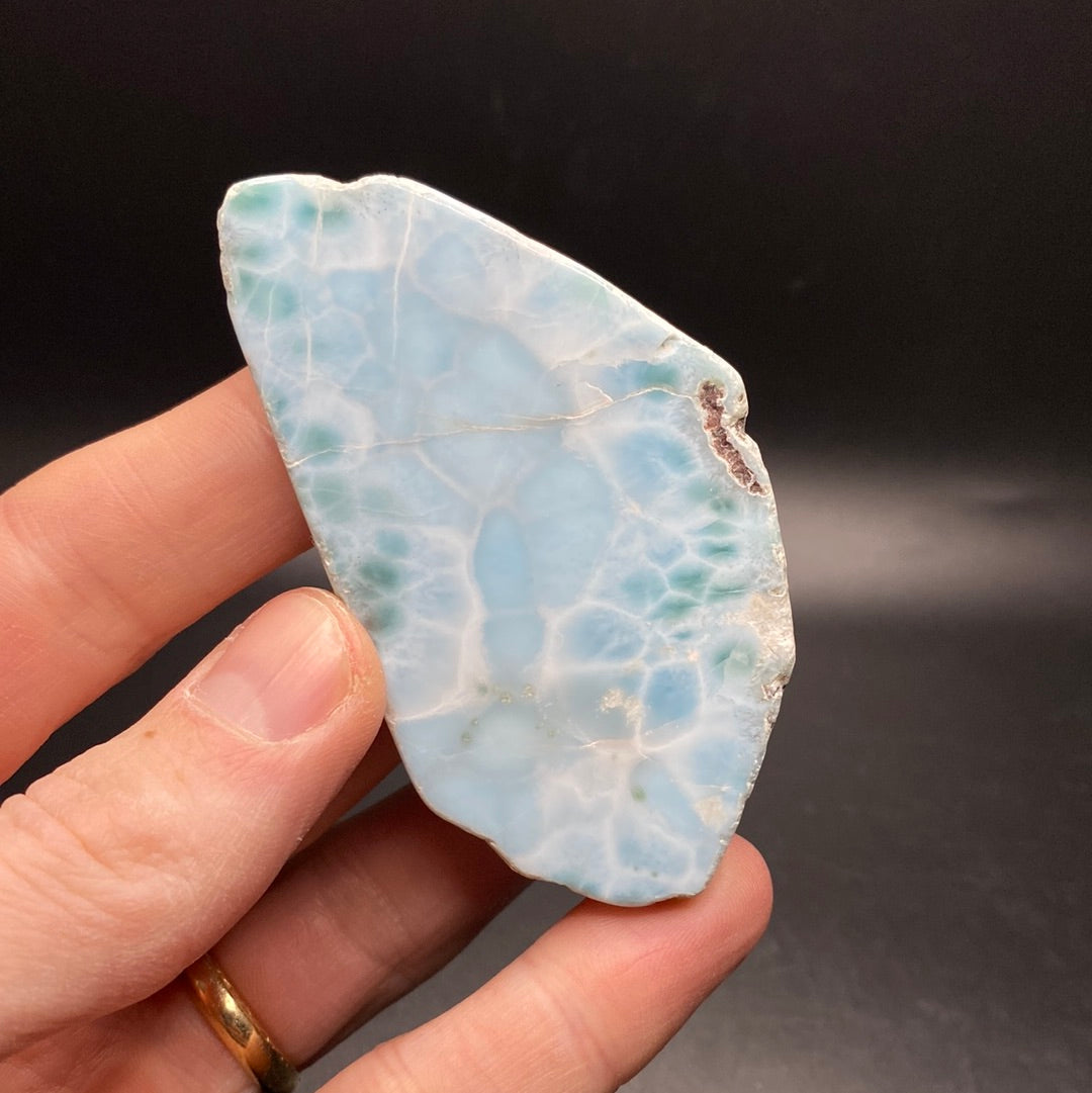 This is a high grade polished slab of Larimar from the Dominican Republic. Weighs 63.5g.