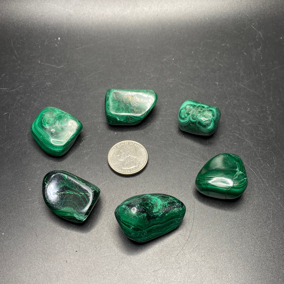 Tumbled Malachite with bright green color and great malachite patterns.