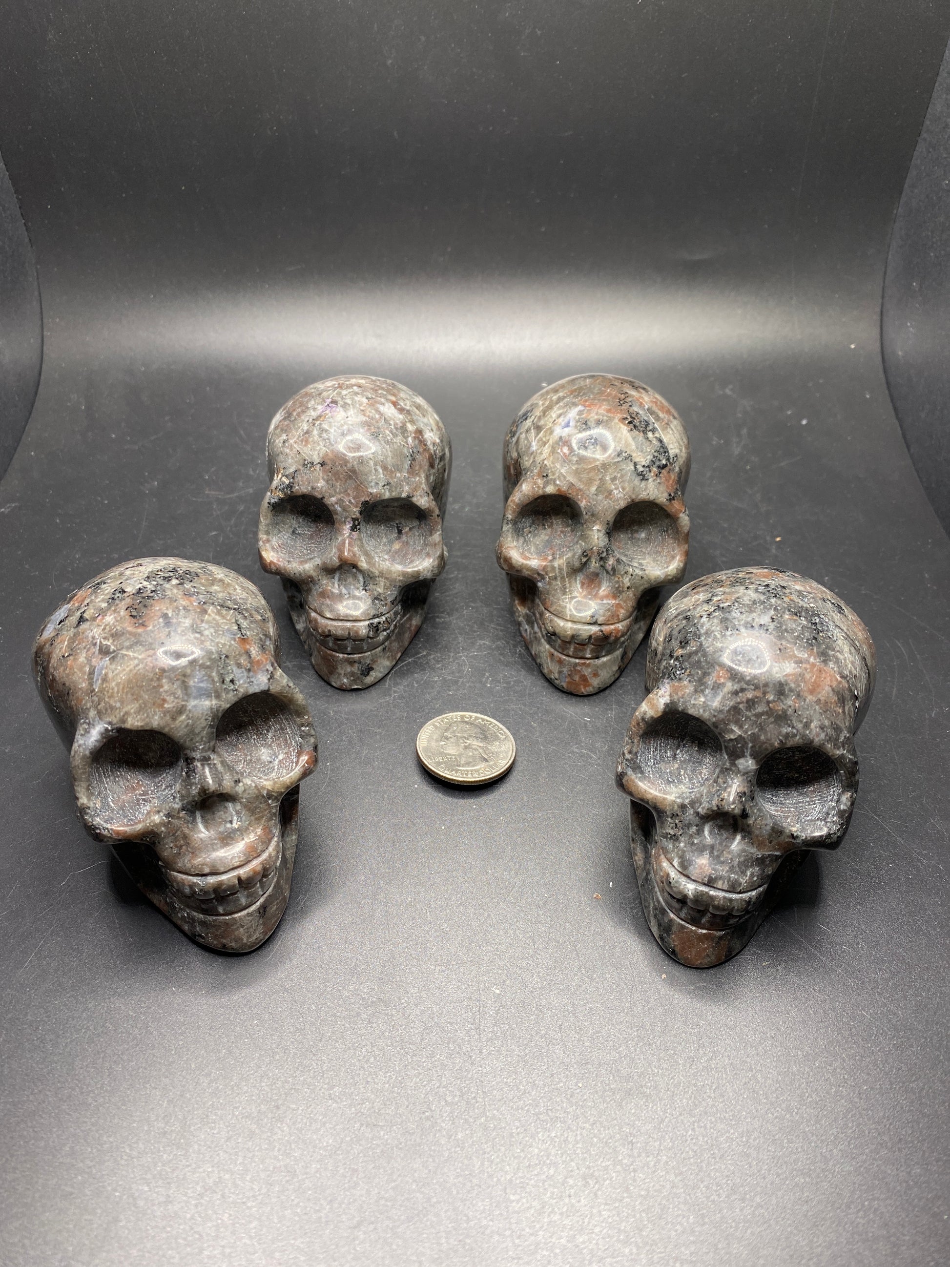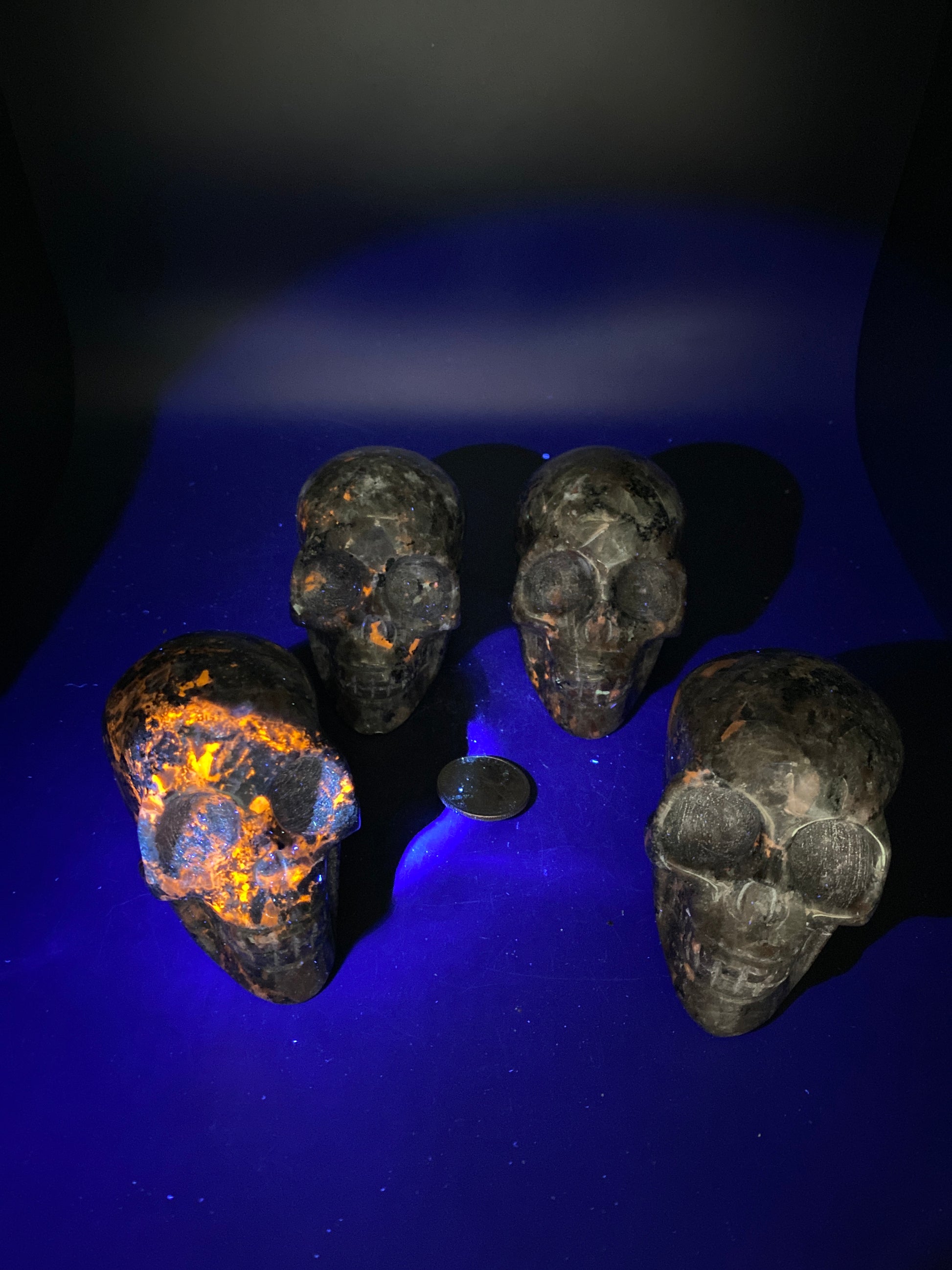 Experience the scintillating thrill of an eerie Yooperlite/Emberlite Skull! Glowing a mysterious orange under UV light, this unique piece is sure to liven up any Halloween party. Add a spooky, unforgettable twist to the night with one of these unique skulls!